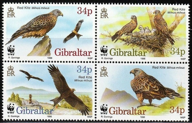 Birds of Prey (Milvus milvus) Red Kite 1996 Gibraltar block of 4